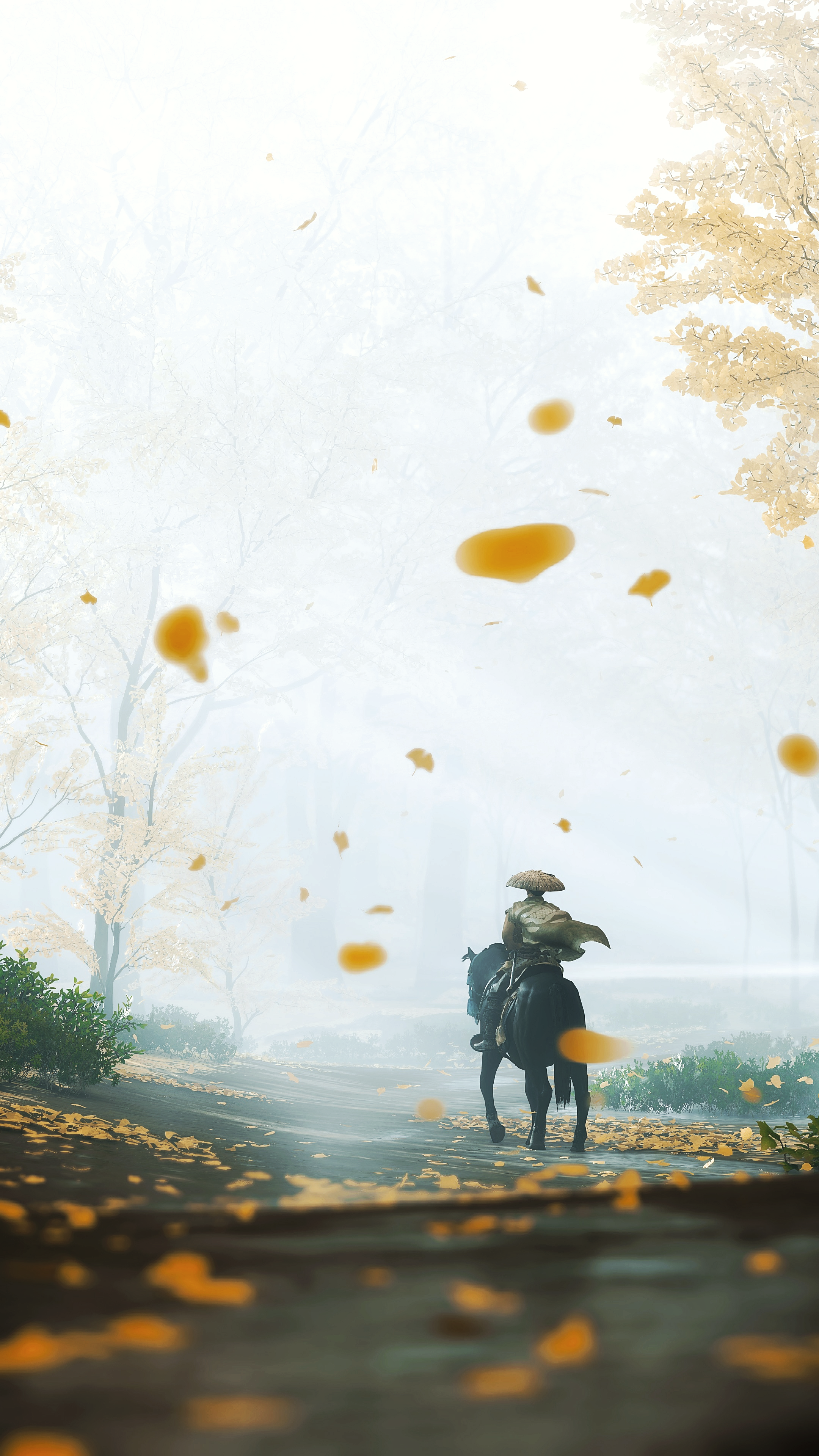 A person riding a horse on a path surrounded by trees shedding orange autumn leaves, with some falling and scattering around, in a misty or foggy setting. The capture was taken by @niinakaniin.vp in Ghost of Tsushima, created by Sucker Punch Studios.