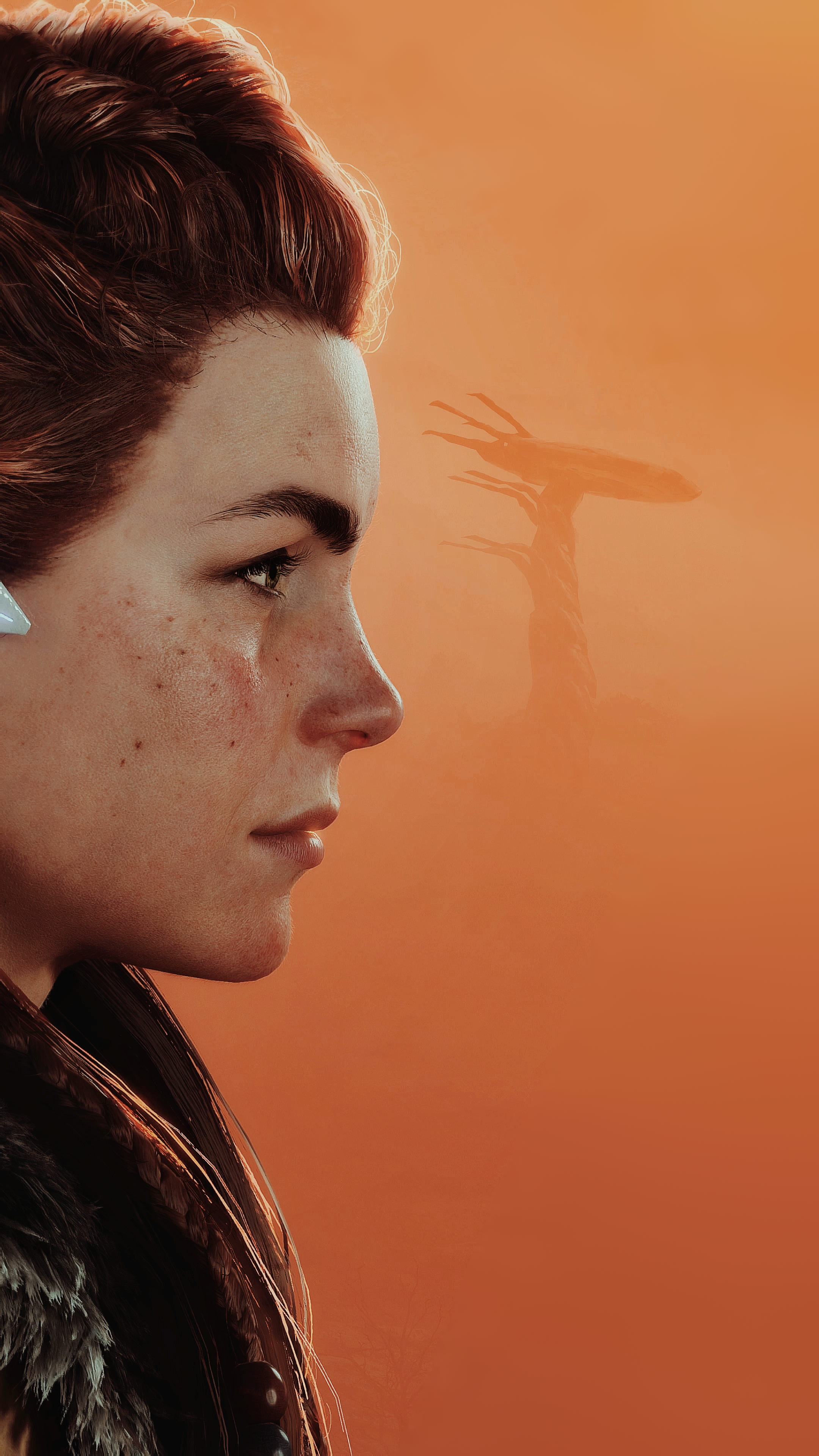 Aloy, the protagonist of a popular gaming franchise called Horizon, created by Guerrilla Games, with long red hair wearing a futuristic outfit, standing against a blurred orange and red background. The capture was taken by @niinakaniin.vp.